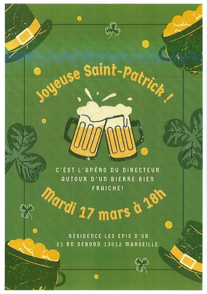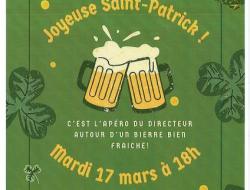 Pour la St Patrick, le 17/03/2026, nous vous proposons de venir trinquer ensemble autour d'une bière et d'un apéritif détendu à 18h pour marquer ce moment de convivialité qui nous vient d'Irlande!
