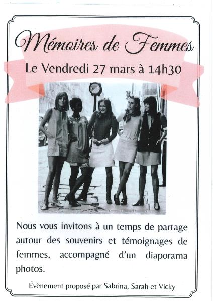 Notre animatrice, Vicky, avec l'équipe d'ASG du PASA, propose une projection le 27/03 autour des souvenirs de femmes célèbres mais surtout de nos résidentes qui les ont partagés en ateliers "mémoires" par exemple.